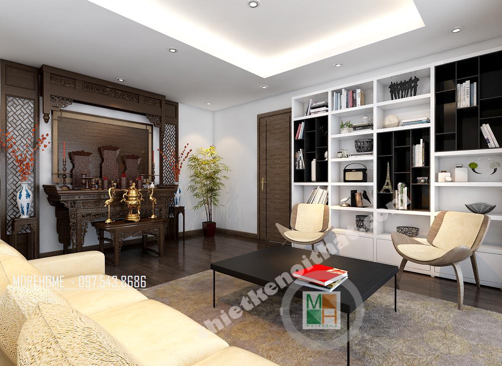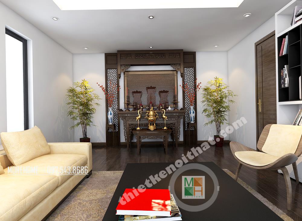 Bàn thờ này là bàn thờ tổ tiên hoặc bàn thờ Phật cũng có thể thiết kế kiểu này, mang lại nét sang trọng và hiện đại cho không gian, phối hợp với phòng khách giúp tiết kiệm diện tích