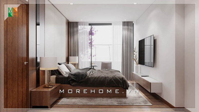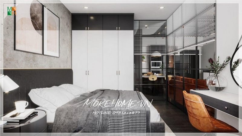 Thiết kế phòng ngủ chung cư đơn giản, hiện đại, các chi tiết nội thất không quá cầu kỳ nhưng vẫn đảm bảo công năng trong quá trình sử dụng
