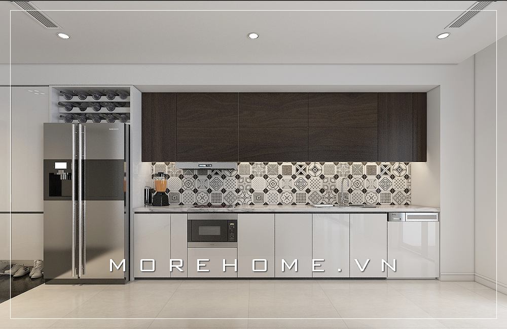 Thiết kế nội thất phòng bếp chung cư với tone màu trắng hiện đại tạo nên không gian thoáng mát và sạch sẽ hơn