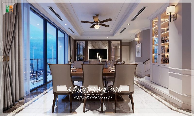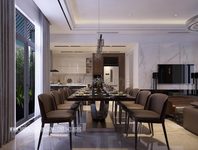 Mãn nhãn với thiết kế bộ bàn ghế ăn gỗ tự nhiên bọc nỉ cao cấp, nó góp phần tôn lên vẻ đẹp tân cổ điển xa hoa sang trọng của phòng ăn trong căn biệt thự cao cấp.