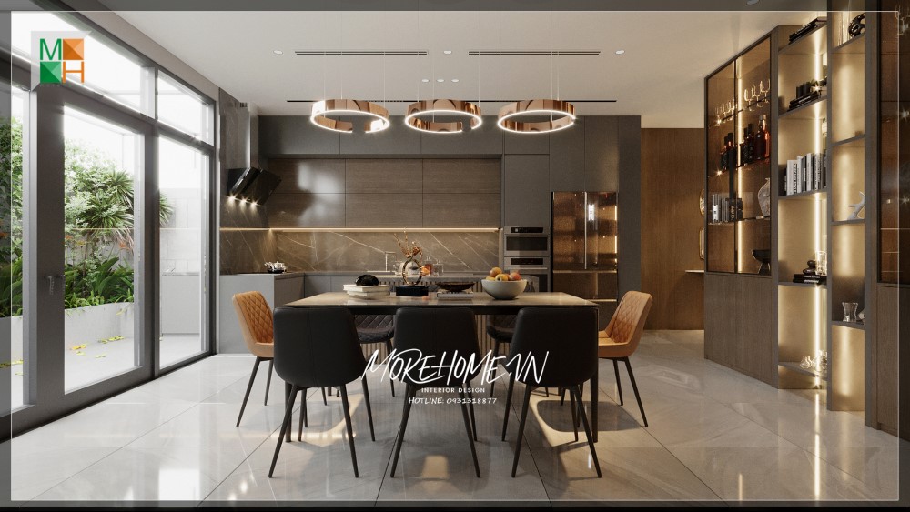 Thiết kế nội thất phòng ăn liền bếp với màu sắc đồng điệu và tủ bếp gỗ chữ U hiện đại sẽ giúp bạn có được sự tiện nghi trong sinh hoạt hàng ngày.